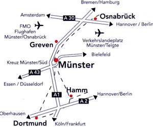 Die Halle Münsterland liegt verkehrstechnisch sehr gut erreichbar (Flughafen Münster/ Osnabrück in ca. 25 Autominuten Autobahnanschluss zur A1 und A43 direkt in Münsters City).