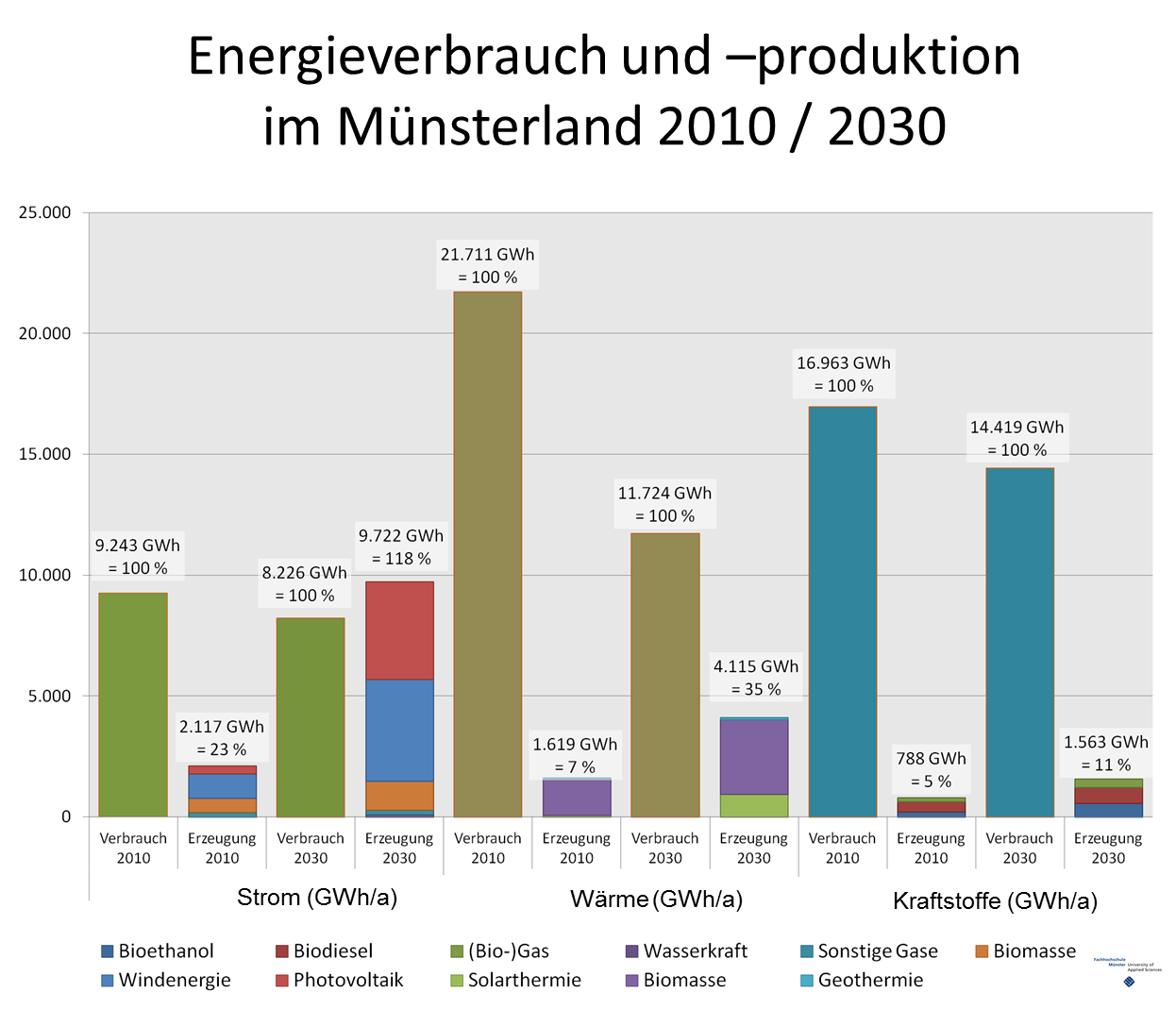 Im Rahmen des Projektes wurden aus den Ergebnissen für alle 66 Kommunen des Münsterlandes spezifische Energiesteckbriefe abgeleitet und zur Verfügung gestellt. Damit ist erstmals auch eine auf kommunaler Ebene vergleichbare Datengrundlage und interpretation geschaffen, die dank des Bilanzierungswerkzeugs "ECORegion" auch für zukünftige Bilanzierungen nutzbar sowie auf andere Kommunen und Regionen übertragbar ist.