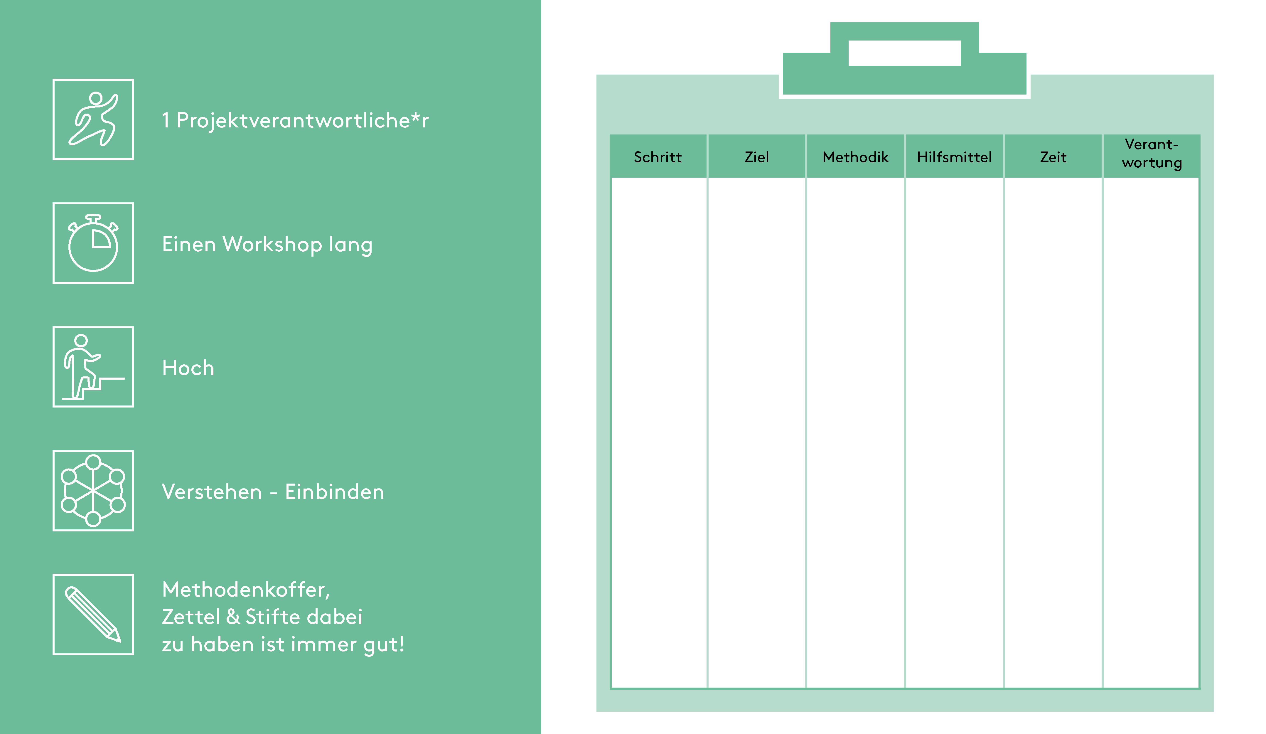3. Erstellt euch einen Moderationsplan, in dem ihr die einzelnen Schritte, das jeweilige Ziel, die Methodik, notwendige Hilfsmittel, den Zeitraum sowie die Verantwortlichkeiten festhaltet.