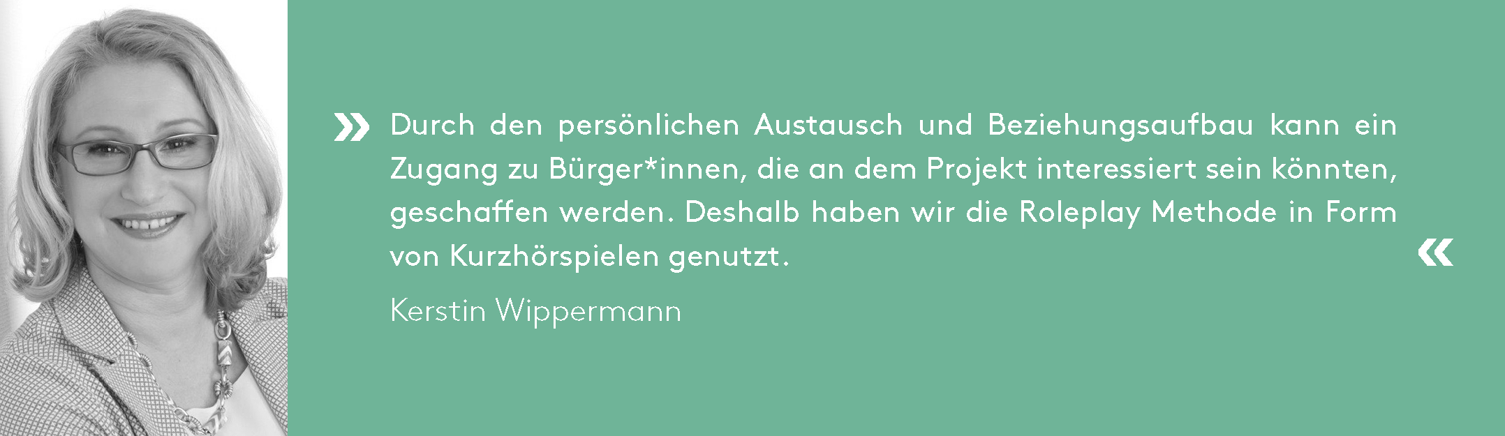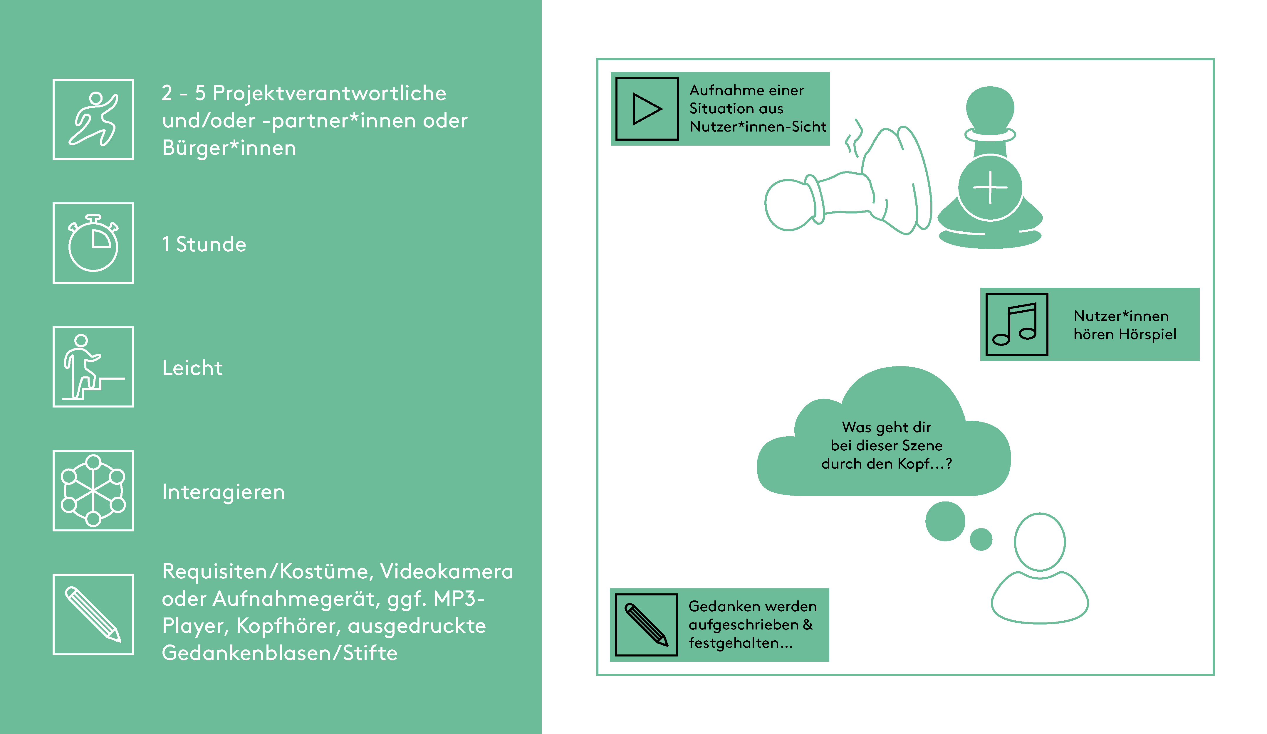 6. Alternativ zu einem klassischen Roleplay, bei dem ihr die Sichtweise der Nutzer*innen einnehmt, könnt ihr auch direkt eure Zielgruppe in die Methode integrieren. Nehmt hierfür ein Hörspiel auf, in dem die jeweilige Situation aus Sicht der Zielgruppe geschildert wird.